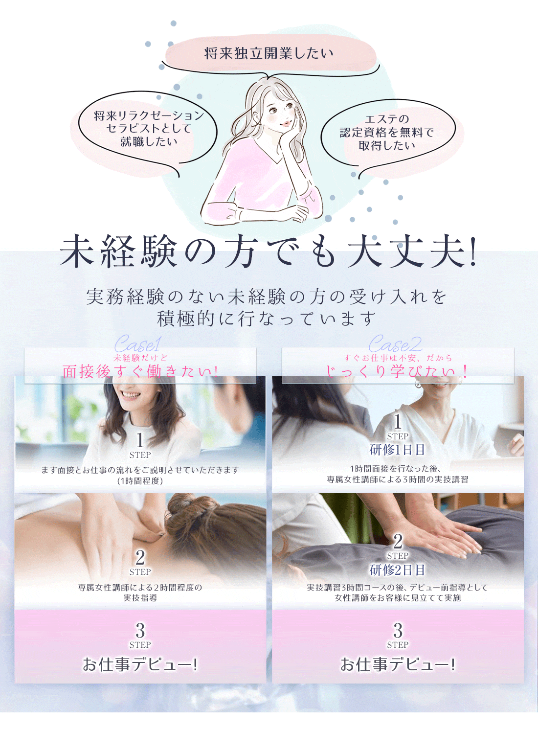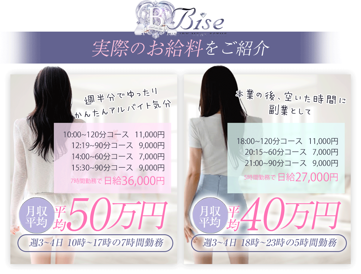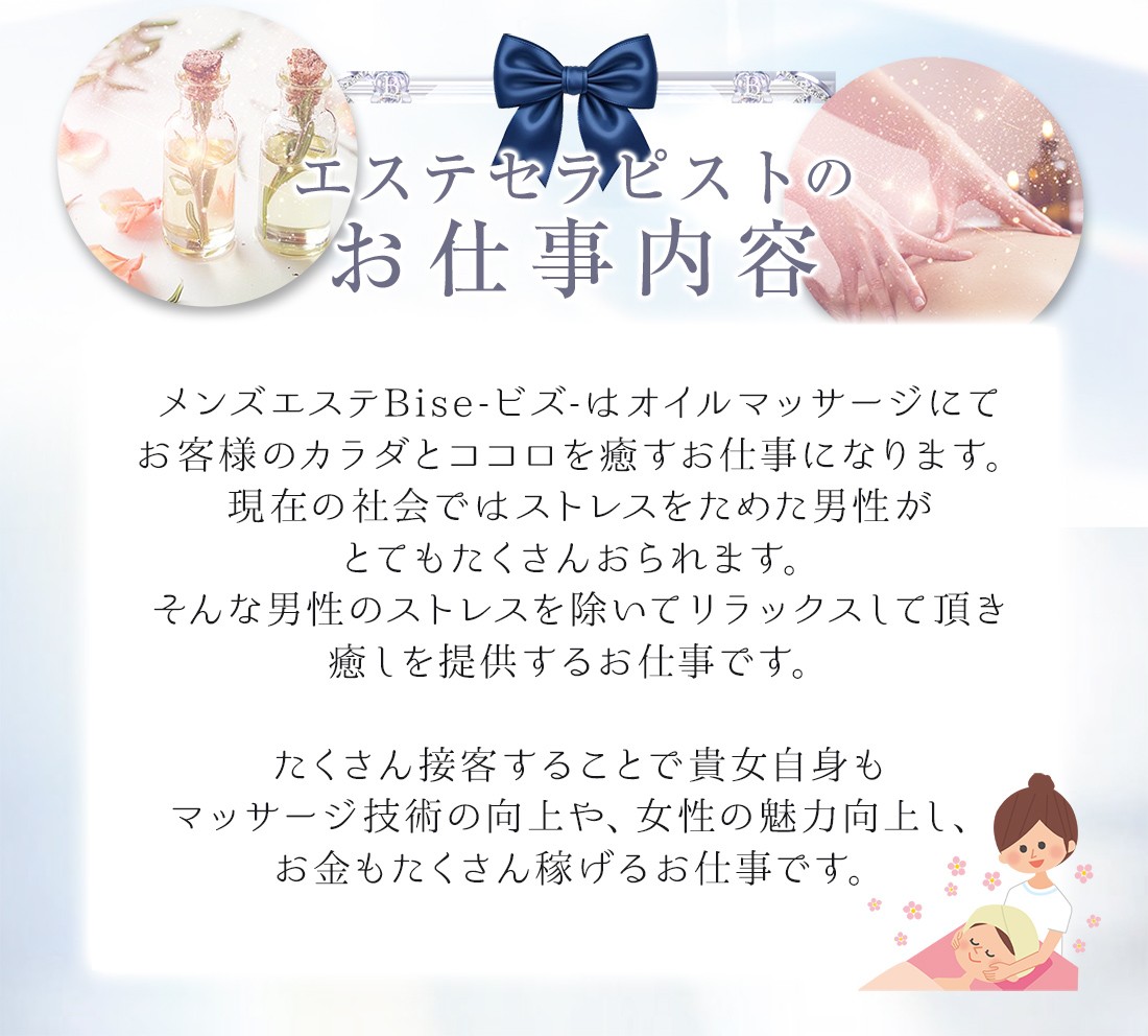 | もちろん大丈夫です!未経験の方でも面接1時間・研修1時間程度ですぐに働いていただけます^^ メンズエステBise-ビズ-では8割以上のセラピストさんがエステ初めての女性です。 女性講師さんが常にいるお店ですので、未経験の方でもすぐお仕事して稼いでいただけます♪ |