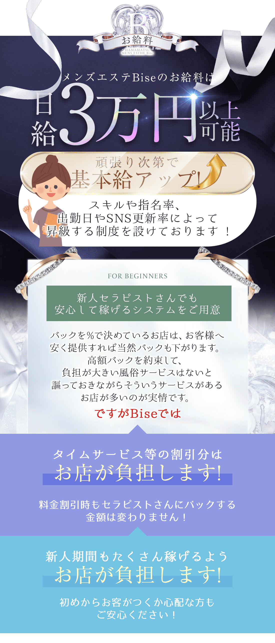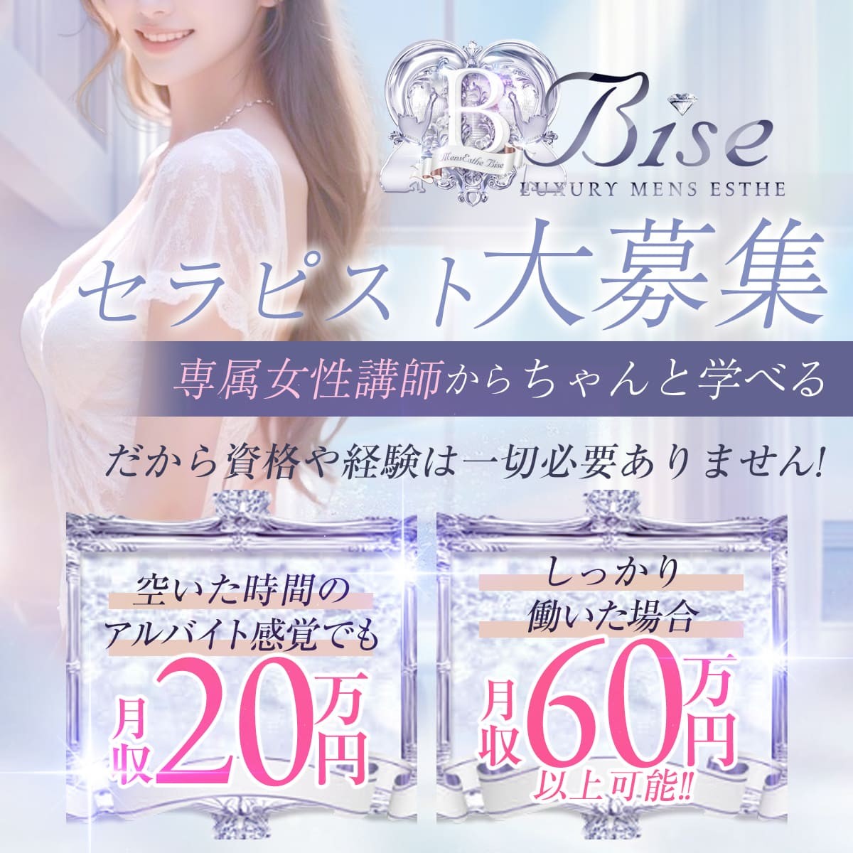 | もちろん大丈夫です!未経験の方でも面接1時間・研修1時間程度ですぐに働いていただけます^^ メンズエステBise-ビズ-では8割以上のセラピストさんがエステ初めての女性です。 女性講師さんが常にいるお店ですので、未経験の方でもすぐお仕事して稼いでいただけます♪ |